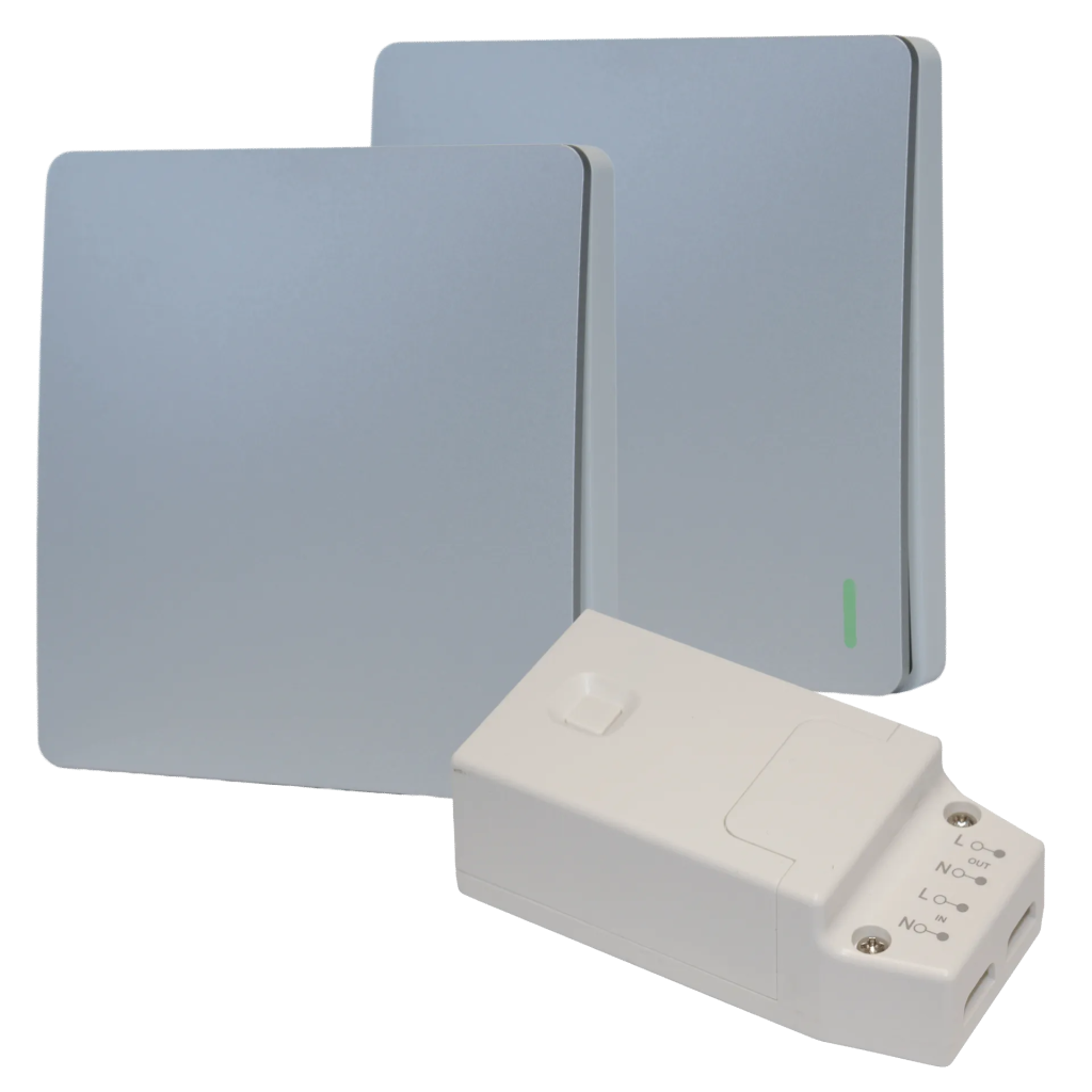 Dva soběstačné nástěnné jednotlačítkové vypínače FENIX-1 ve schodišťové kombinaci s přijímačem X21 s funkcí Wifi, stmívání a maximální zátěží LED osvětlení 100W.