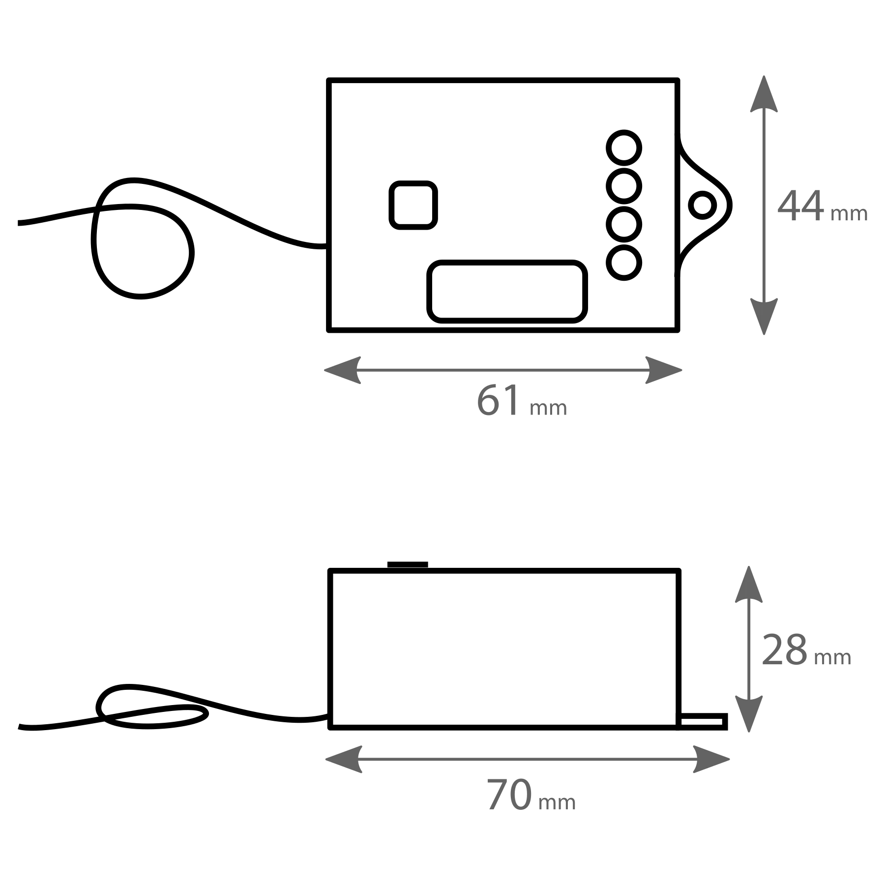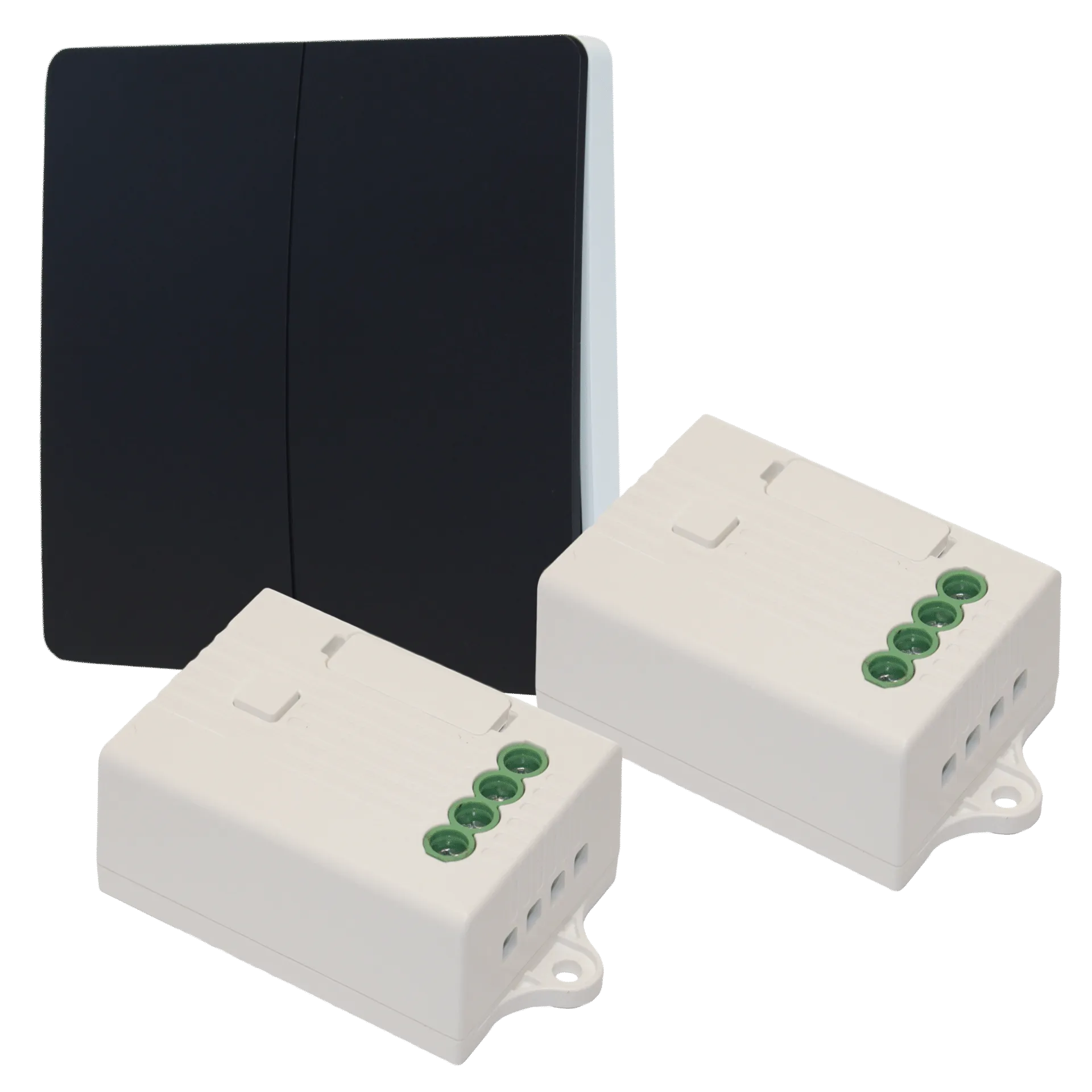 Samowystarczalny wyłącznik ścienny dwuprzyciskowy FENIX-2 w połączeniu z dwoma odbiornikami X1 z funkcją ściemniania i maksymalnym obciążeniem oświetlenia LED 300W.